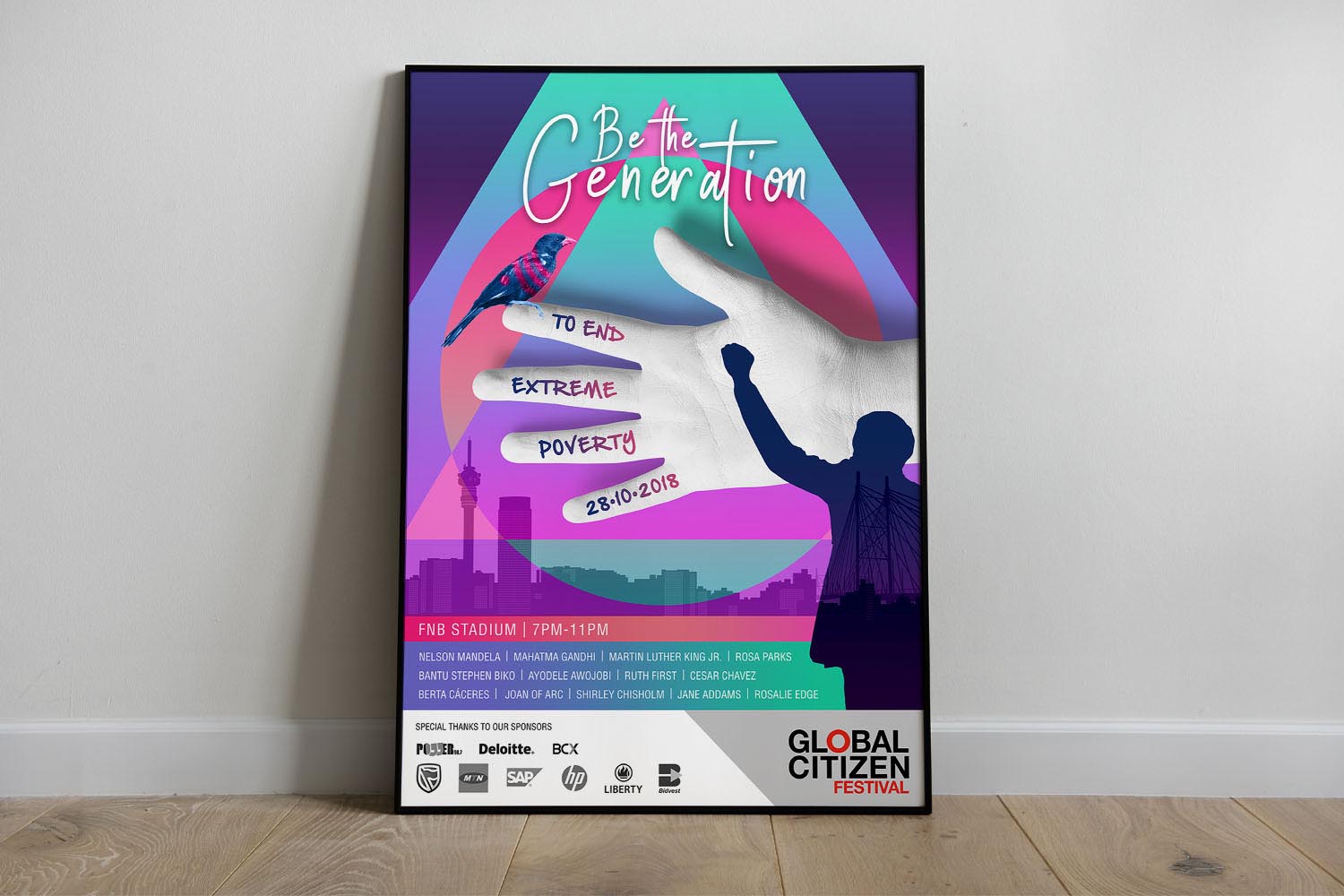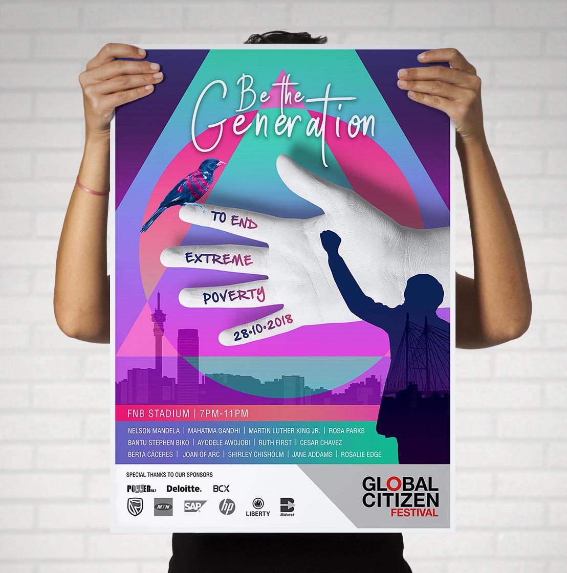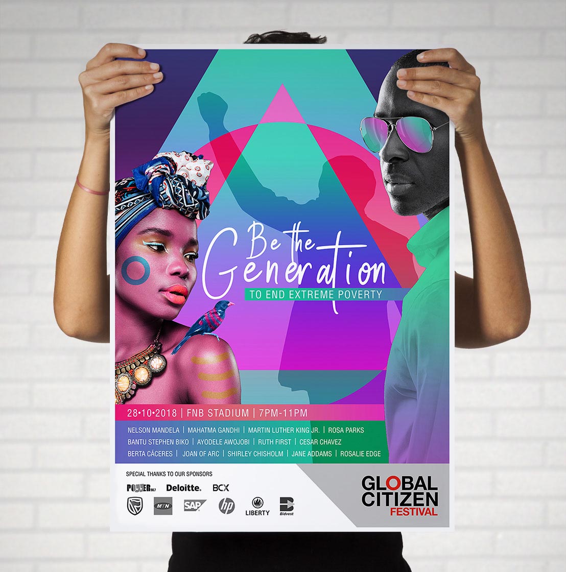 The idea for the poster design was to tell a story in an unusual, eye-catching way. So I used bold, bright, almost neon 80's style colours to grab the viewers’ attention. One of the competition requirements was to include an image of Madiba, Nelson Mandela. Due to his image being heavily copyrighted, I decided to use Mandela's image in silhouette. The design style is retro 80's, with lots of shapes, 3D objects, photos and gradients in a collage.
